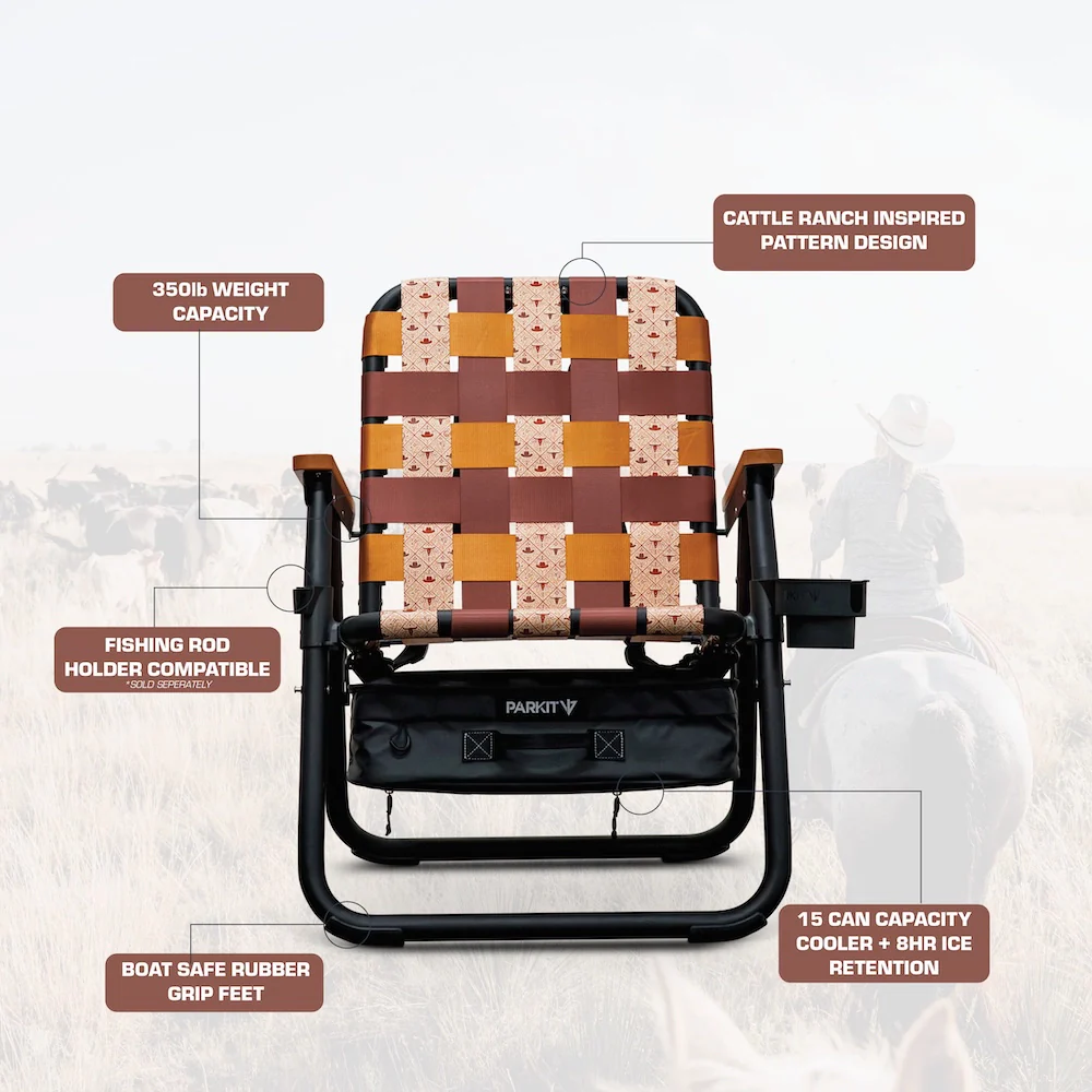 Wrapped in a custom woven pattern featuring subtle nods to frontier iconography - horns, hats, and western lines - Outrider carries the character of cattle country wherever you set it down. It’s a seat that feels right at home beside a campfire, parked along a fence line, or resting after a long day under big western skies.