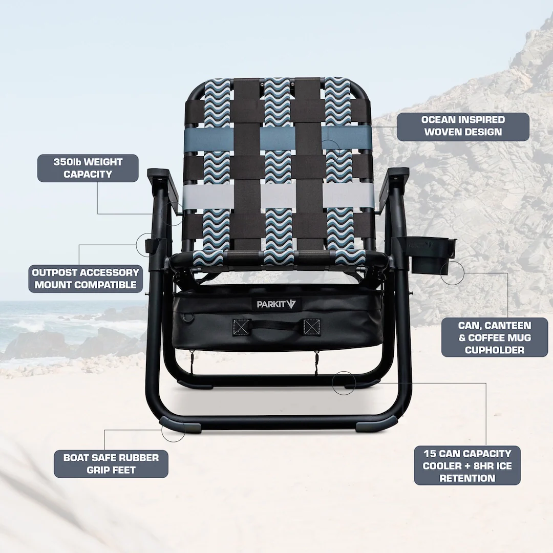Framed in PARKIT’s signature Voyager chair design and built with stainless steel and aerospace-grade aluminum hardware, Undertow delivers all the 3-in-1 features you know and love: an integrated cooler to keep drinks cold, ergonomic overlander carry straps for easy carry, and a durable woven seat built to handle years of coastal adventure.